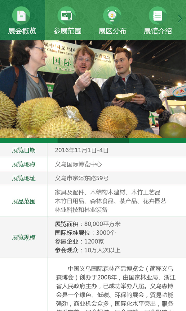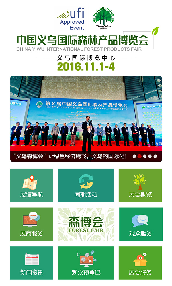 中國(guó)義烏國(guó)際森林產(chǎn)品博覽會(huì)(簡(jiǎn)稱森博會(huì))創(chuàng)辦于2008年,由國(guó)家林業(yè)局、浙江省人民政府主辦,已成功舉辦六屆。森博會(huì)是一個(gè)綠色、低碳、環(huán)保的展會(huì),貿(mào)易功能強(qiáng)勁,商業(yè)機(jī)會(huì)眾多,國(guó)際化水平突出,服務(wù)體系完善,展會(huì)規(guī)模、展會(huì)成交額、展會(huì)影響力均居亞太同類展會(huì)之首,享有“林業(yè)奧運(yùn)會(huì)”美譽(yù)。